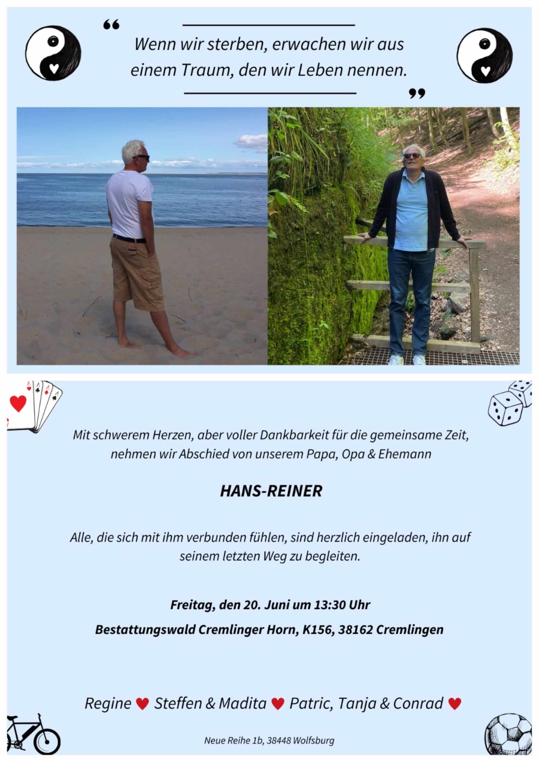 Liebe Trauernde, es ist egal, zu welchem Zeitpunkt man einen Menschen verliert - es ist immer zu früh und es tut immer weh. Daher wünschen wir Ihnen von Herzen, dass Sie durch Worte, Taten oder eine Umarmung Trost, Kraft und Halt finden. Diese Gedenkseite soll Ihnen die Möglichkeit geben, Ihre Trauer zu teilen und das Andenken an einen geliebten Menschen zu bewahren. Herzlichst Ihr Team der Waldbestattung Cremlinger Horn